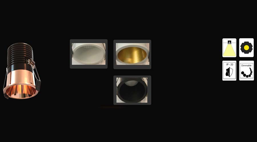 Deep Recess down light luminaire. Best in class COB LED with higher efficacy (>120lm/W) and colour rendering, Deep recessed in housing for visual comfort and tight glare control; Powder coating finished, Die-cast aluminium luminaire housing with aerodynamically designed fins for better heat dissipation. Two-part secondary optics with anodized aluminium spun reflector for precise light beam control at the top and the lower part in different finishes comfortable visual conditions. Higher efficiency electronic driver mounted on gear tray with appropriate electrical connectors for remote installation. High tension spring steel toggle for installation on to false ceiling.