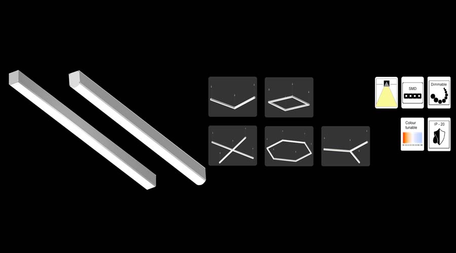 Extruded aluminium Linear LED luminaire of rectangular cross-section with flat / curved Polycarbonate serrated opal clip-on diffuser. Luminaire suitable for suspended installation in individual , linear continuous or regular geometrical patterns. High efficacy SMD LED chips placed on electro-mechanically stable board for better heat dissipation and trouble free long life. Luminaire available with specific colour temperatures or with tunable white options, and with fixed output or dimmable integral gear in 24W, 30W, 36W or 40W ratings.